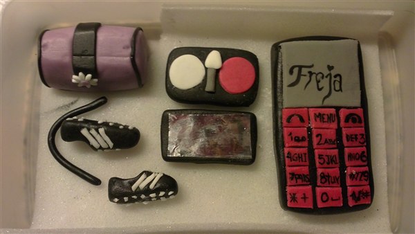 Billede nr. 17: pynt til frejas kager. Gugmus har lavet telefon, støvler, og make-up.