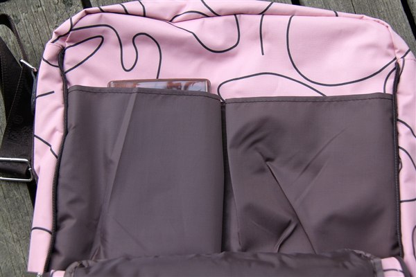 Der er et stort rum indvendigt, med 2 thermo flaske holdere - 1 i hver side, samt en stor lynlåslomme indvendigt.