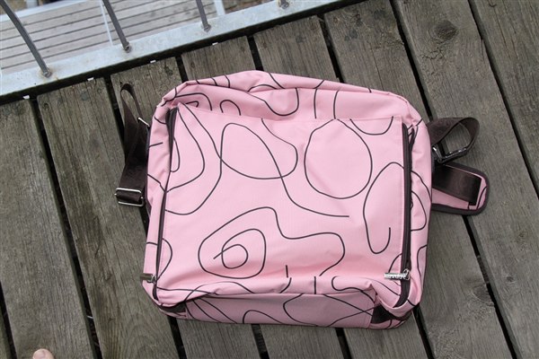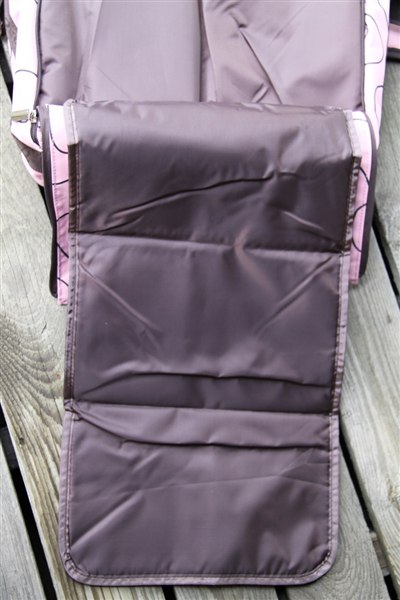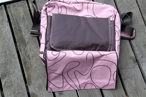 Hele bagsiden kan lynes op, og der er 2 lommer til fx, bleer og en puslemåtte, der kan knappes af. Derudover er der en plastik beholder med til fx vådservietter eller lign.
