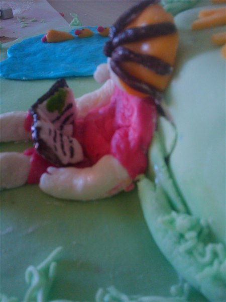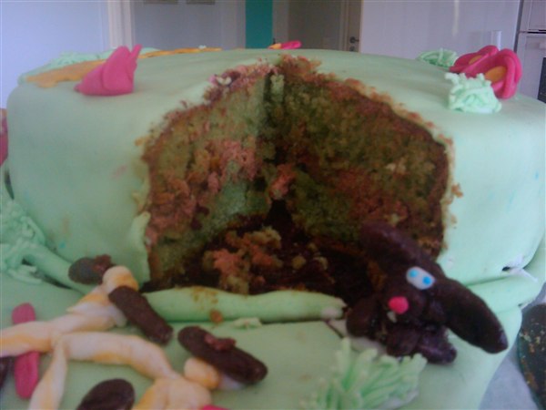 Bamseboet :D skriver: og i den anledning har jeg lavet en kage til ham.. -som han blev rigtig glad for. -Den nederste er chokoladekage med hindbær skum, og den runde er grøn kage med skildpadde skum.