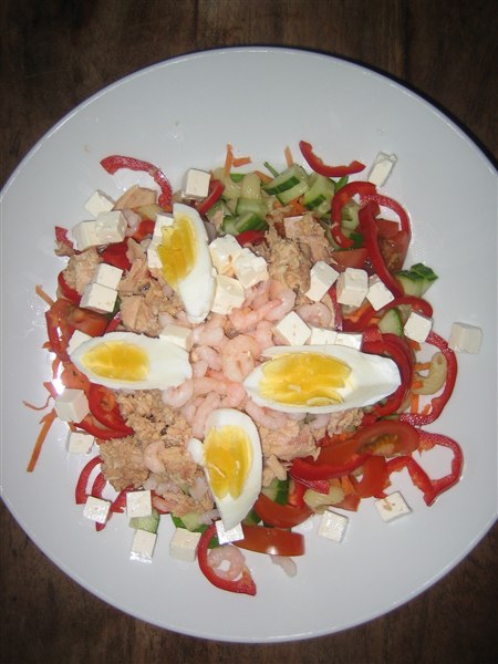 Resultatet blev en stor salat med pasta, tun, rejer, agurk, peberfrugt, tomat, gulerødder, æg, fetaost og salat (selvfølgelig). Og den smagt fantastisk