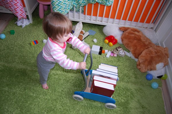 hun går med gåvogn (med bøger i) nu, frem og tilbage, frem og tilbage