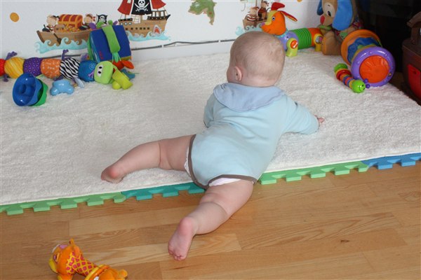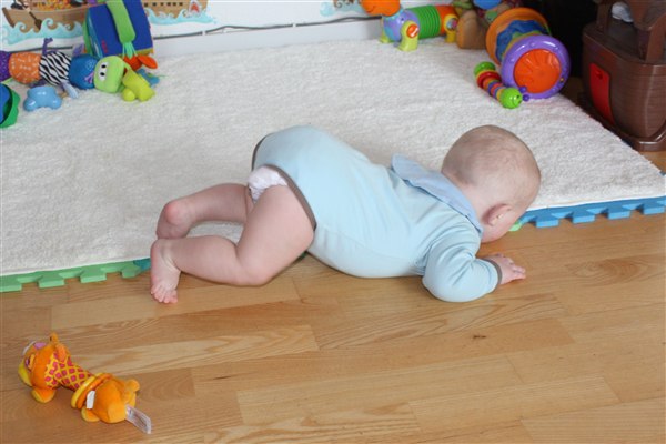 Min yngste datter, Victoria på 8 mån, er ikke begyndt at kravle endnu, men gør store og flotte forøg på at komme op i knæene. Hun skubber sig mest baglæns og bliver super sur, når hun støder ind i et møbel, som stopper hende. Det gjorde Isabella også til at starte med.