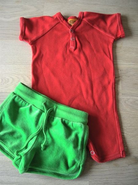 Billede 5. Rød sommer heldragt fra Katvig i lille str. 74. I perfekt stand. Pris = 50 kr. Små grønne velourshorts, også fra Katvig i str. 68. pris = 20 kr.