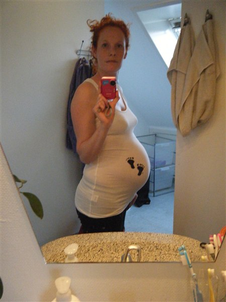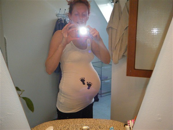 Jeg købte en billig lang undertrøje i Bilka (25kr) og hapsede fødderne herfra baby-logoet, printede dem ud og tegnede efter med nogle stoftusser...