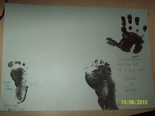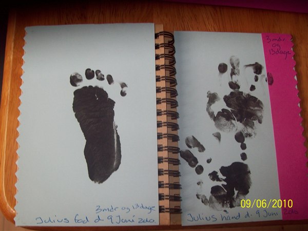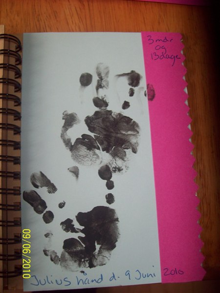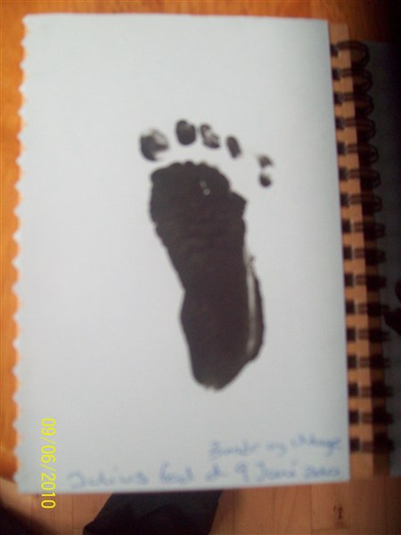 1 fra Julius, den med aftrykkene. Nej hvor var det svært at lave aftryk af hans hånd. Han har helt sorte negle nu, rundt i kanten