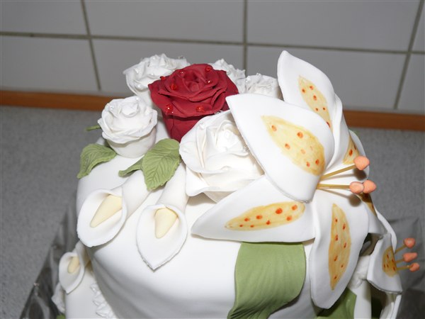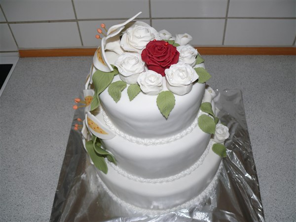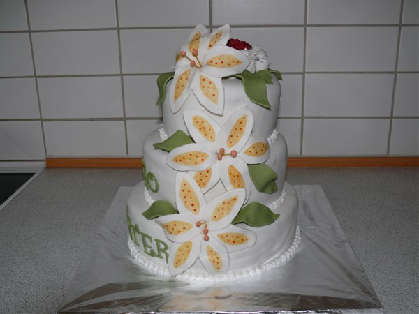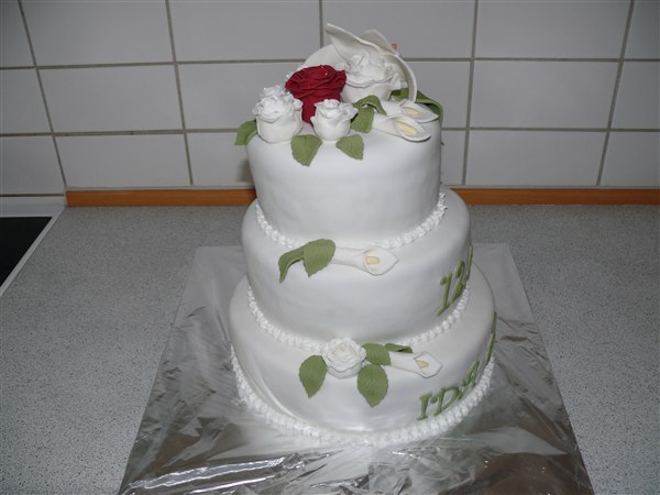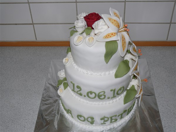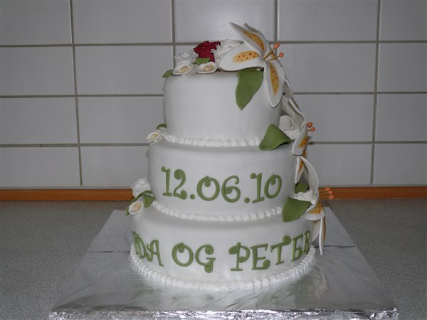 Bryllupskagen til Ida og Peter. Ønskerne lød på blomster og der skulle indgå én rød rose ellers sku resten af blomsterne være hvide og teksten skulle stå med grøn. kagen indeholder chokoladekagebunde, 1 lag hvid tobleronecreme med groft hakket mørk chokolade og et lag hindbærmousse uden fløde.
