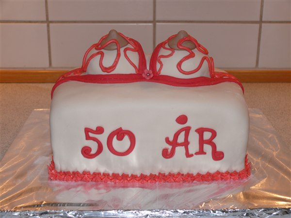 Babsekagen er til en 50 års fødselsdag og består af chokoladekage bunde, 1 lag marabou-daim creme og 1 lag hindbærmousse