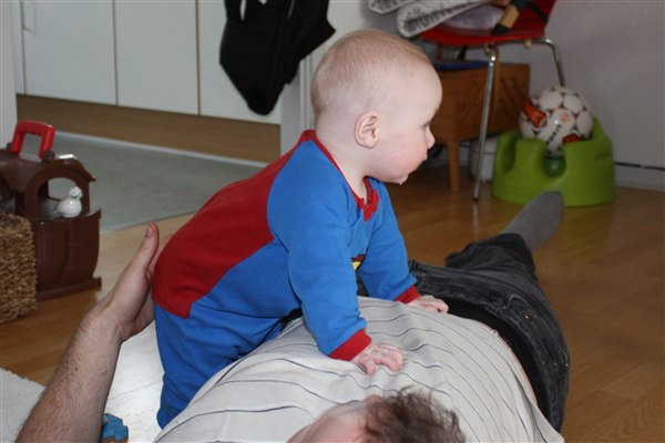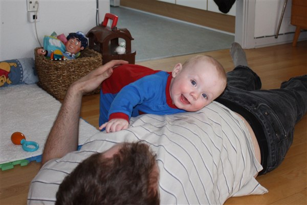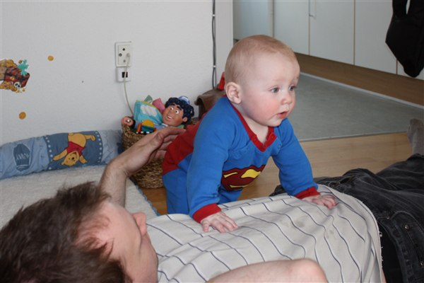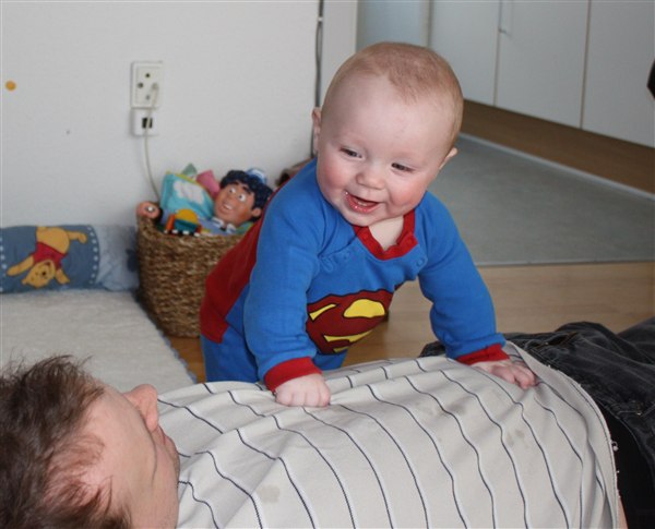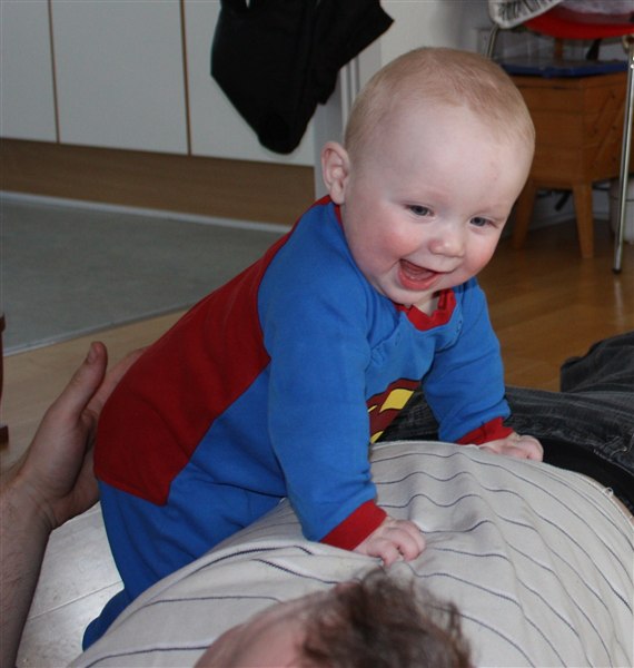 ) ! Han er begyndt at rejse sig op af ting og sager, og det må man ikke, man skal altså lære at kravle når man kun er knap 7 mdr, dælme ikke gå det kan benene da slet ikke holde til