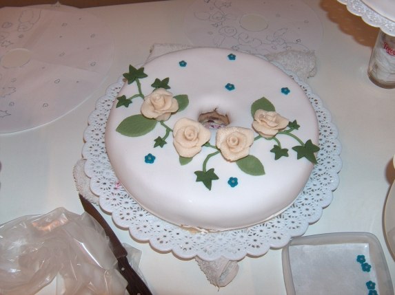 Jeg skal betrække en kage med hvidt "overtræk". Det er kun toppen af en bryllupskage, da de nedre lag skal være muffins, men brudeparret vil gerne have at det øverste lag var en rigtig kage som du kunne skære af. Derfor skal jeg have købt noget sugarpaste eller lign. Jeg ORKER ikke at lave det selv, både fordi jeg kun skal bruge så lidt og det derfor ikke er så dyrt, plus fordi jeg ingen mikrobølgeovn har og så ikke lige kan overskue hvordan jeg så skal blødgøre/lave det!