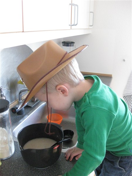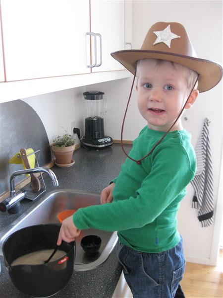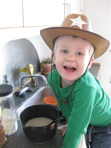 Her er min Magnus, som synes at man skulle have cowboy-hat på når man bager brød!