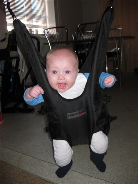 Den store gik da hun blev et år og den lille som 10 mdr gammel. Vi har aldrig brugt hoppegynge. Jeg ser den på samme møde som babybjørn bæreseler og lign. Det kan virkelig ikke være behageligt for barnet at side der. Jeg tror det vil svare til at du sidder dig på en ryttercykel uden at kunne nå jorden. De kære små hænger bare og dingler, der er ikke noget der støtter