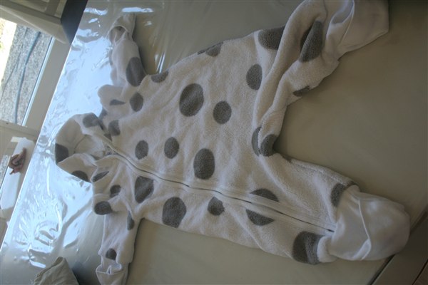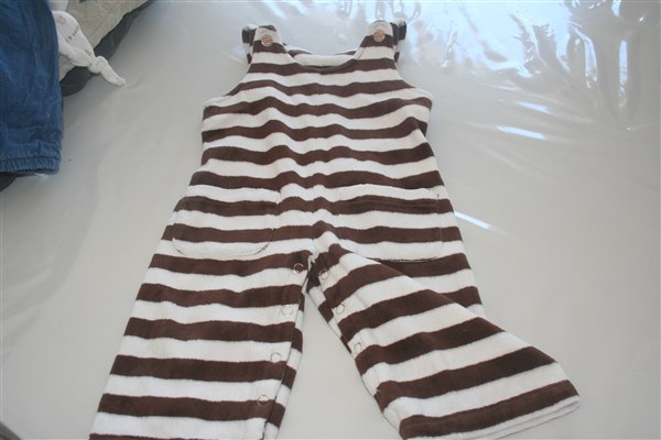 23. katvig velour heldragt med brune striber. str. 68 pris 35 kr.