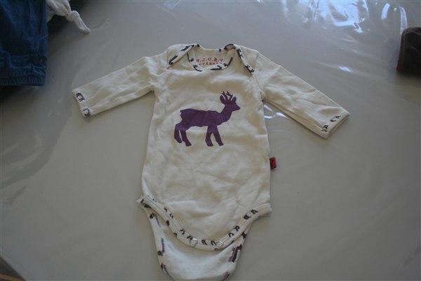 4.hjort body med lilla. str. 0-3 md. lidt stor i det synes jeg. pris 20kr.