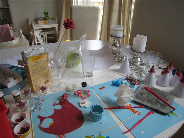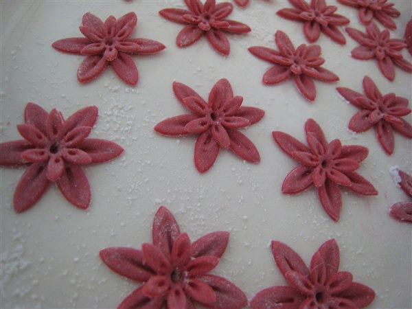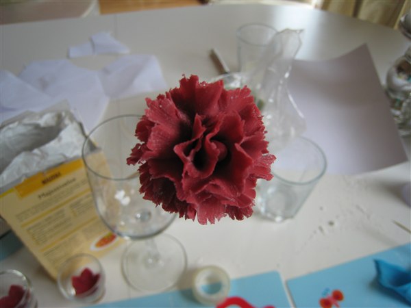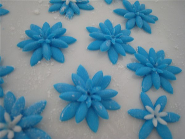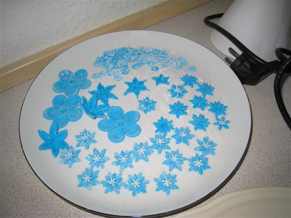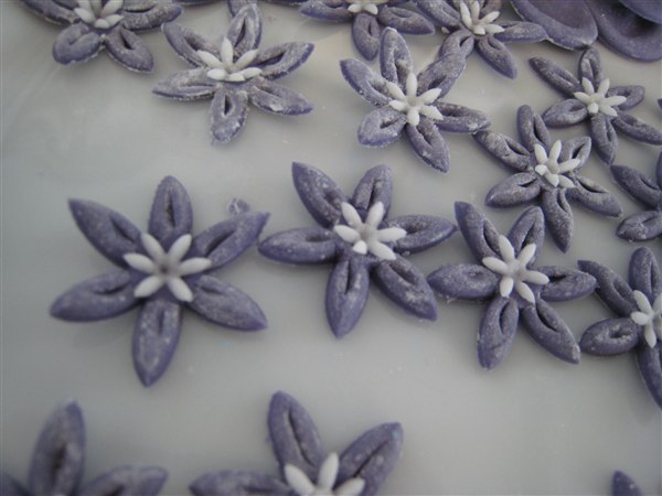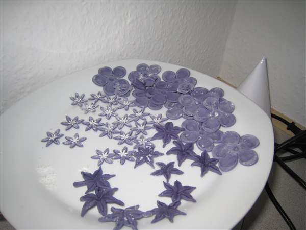 Se piger, hvad jeg bruger tæt på alle vågne timer på i øjeblikket - en gammel studieveninde skal giftes og har spurgt mig, om jeg vil lave bryllupskagen for dem...og det kunne jeg da ikke sige nej til designet skal være et VÆLD af blomster i alle farver og faconer, så jeg har TRAVLT med at modellere blomster og MANGE af dem her er lige nogle billeder af hvordan det ser ud efter tre dages arbejde...(blomsterne har stadig mel på - derfor de ser lidt "støvede" ud - og som I kan se er jeg nået igennem blå, rød og lilla )