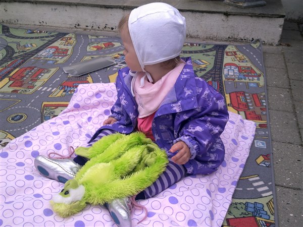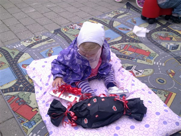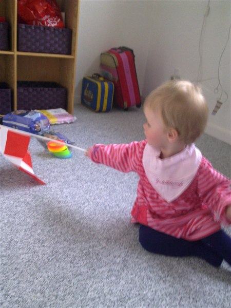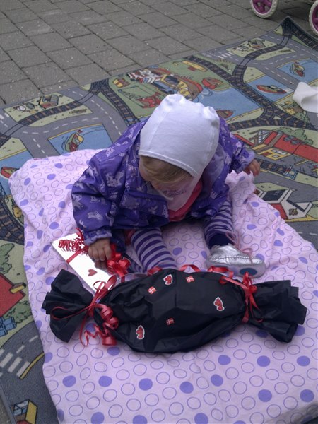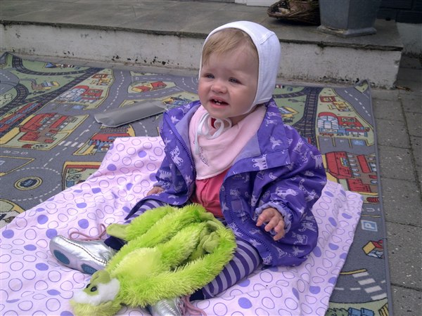 Ja det var en rigtig hyggelig dag. Det startede med at vi kunne høre Carla lå og pludrede inde i sin seng. Vi havde flagene lagt klar inde i soveværelset og så listede vi os ind til hende og sang lige så stille fødselsdags-sang for hende mens vi viftede forsigtigt med flagene. Hun lå og kiggede på os ligesom: Hvad laver I og så rimelig utryg ud ved situationen. Vi sang derfor kun første vers og så begyndte hun at hyle, så jeg tog hende op og gav hende et flag og så blev hun glad igen. He he. Vi gav hende en sansegynge og hun var glad da hun så den. Hendes dagplejemor har den samme og hun elsker den. Vi havde ikke hængt den op til om morgenen. Carla fik havregrød med jordbærgrød oveni til morgenmad. Det var guf!!!! Casper tog på arbejde og Carla kom ud til sin morgenlur. Da hun vågnede skulle vi lige ned til hendes dagplejemor og sige god ferie for vi ser hende ikke i 8 uger og så skulle vi lige have hendes tøj derfra. Så havde hendes dagplejemor gave til Carla. Hun fik 2 abe-bamser og noget sandlegetøj. Det var et hit!!!