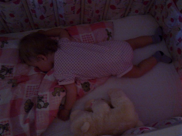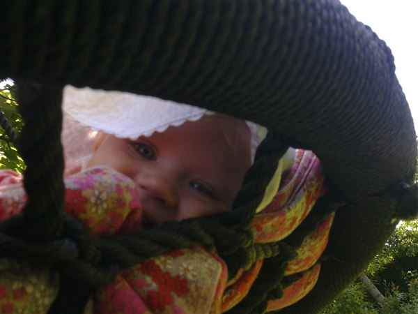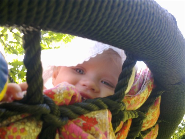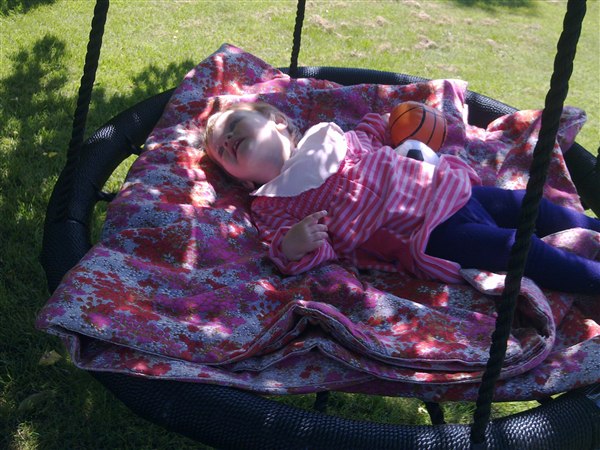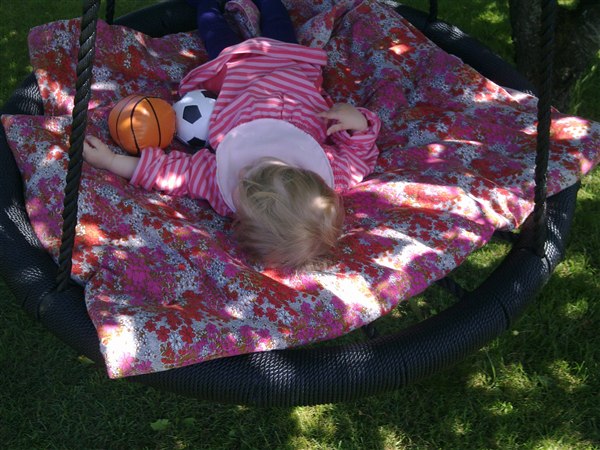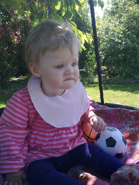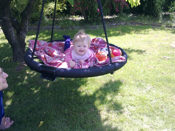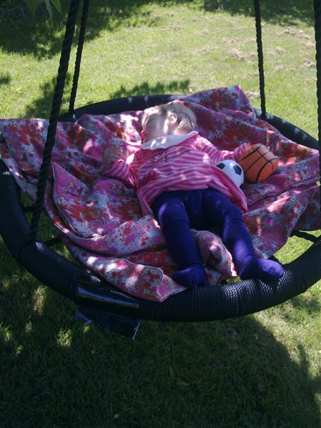 Til middag kom Casper hjem og vi fik hængt gyngen op i vores morel-træ. SÅ hyggede vi os i haven længe. Det var bare skønt! Om aftenen fik hun dejlig mad der var smurt ind i sovs, ligesom hun bedst kan lide det og hun spiste HELT vildt. VI grinede lidt af hende for vi blev ved med at tænke at NU måtte hun da ikke kunne spise mere! Men jo. Og dessert fik hun også: REGNBUE-IS!!! Uha det kunne ikke gå stærkt nok! Munden stod på vid gab. Da vi havde siddet og puttet lidt i sofaen blev hun puttet efter en dejlig dag. Vi havde ingen gæster for de kommer først i morgen og så bliver hun overlæsset med gaver. Det bliver fedt! Dejlig dag!!!!