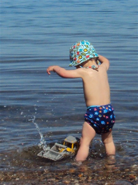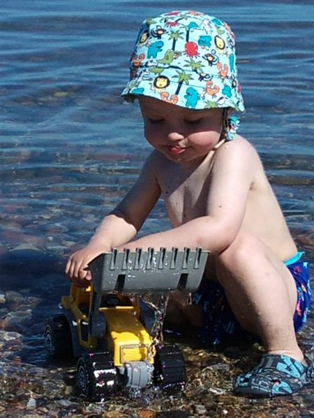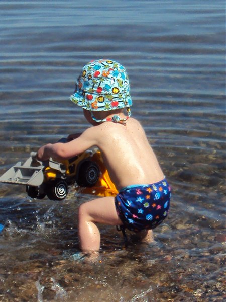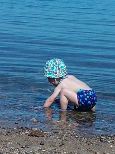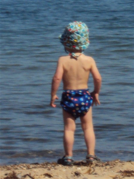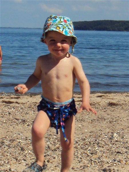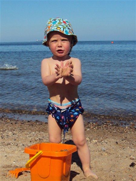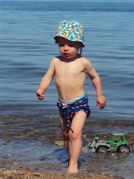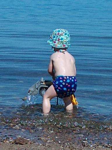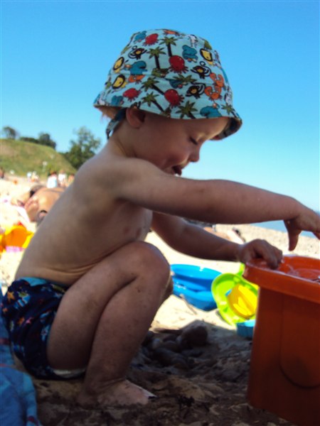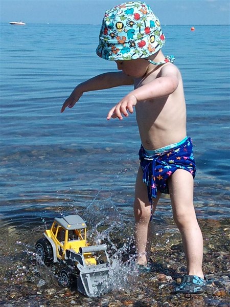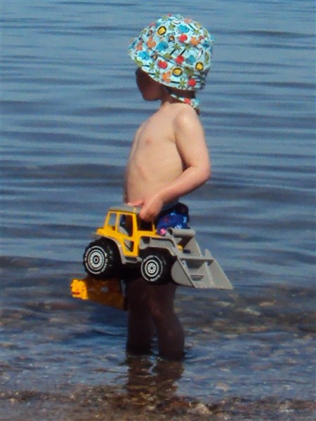 Vi havde taget alle hans sandlege tøj med - parasol - køletaske med drikke varer - ekstra tøj osv....