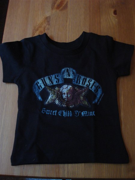 han havde jo allerede fået billetten til Guns n Roses koncerten i Aalborg, men jeg er en sucker for at give gaver, især til ham, så han fik også "den ultimative Black Adder samling", en Tom Petty cd og en lillebitte t-shirt til Baby Juhl med Guns, hvor der står "sweet child o mine" på