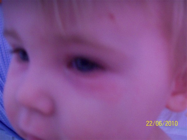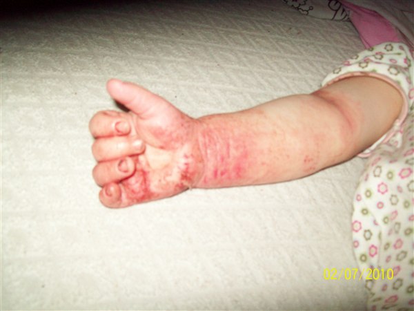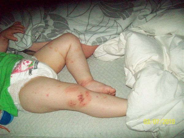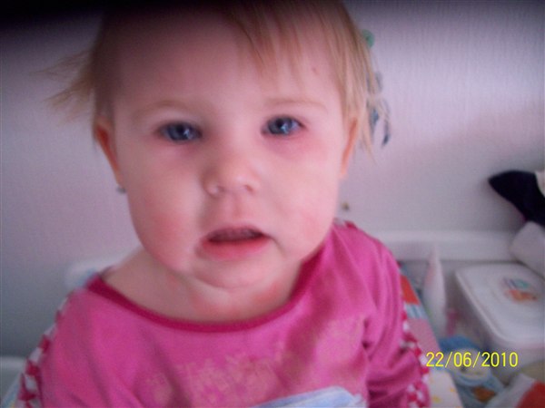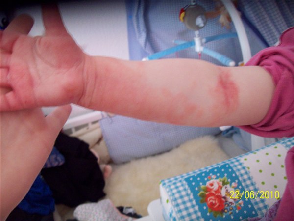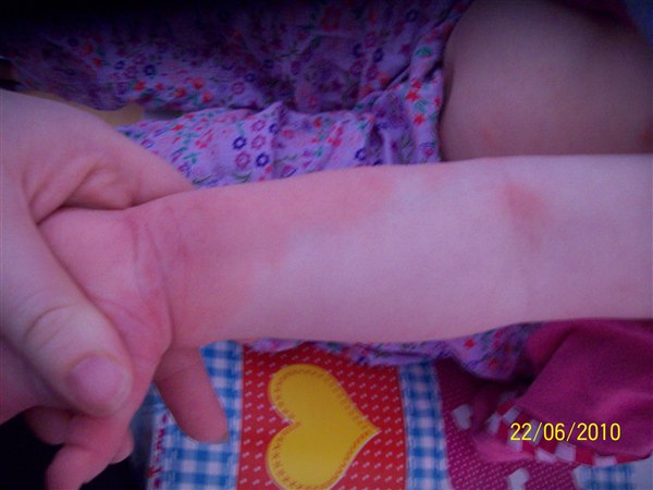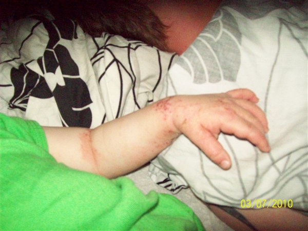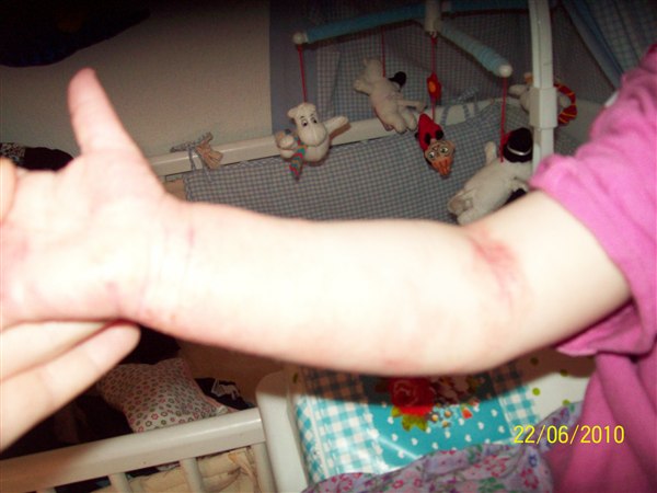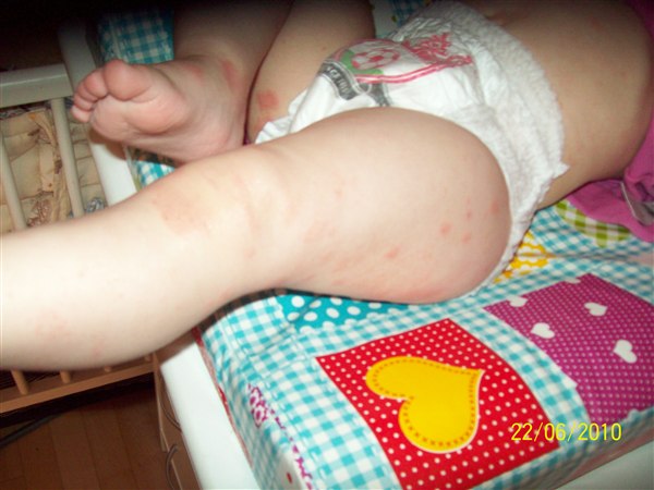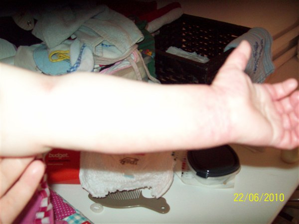 de første billeder er fra første gang det var rigtig slemt, armene er fra i år, de andre fra i dag(grønt tøj. Første sæt er taget kl. 6.33 og andet sæt taget kl. 7.50 og det er efter hun havde kløet sig.