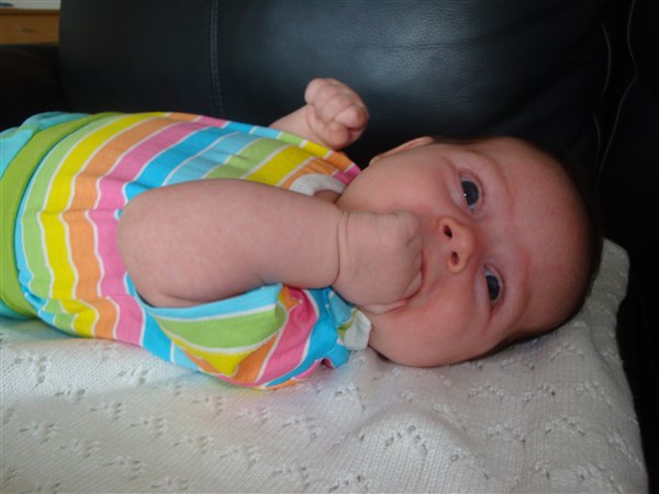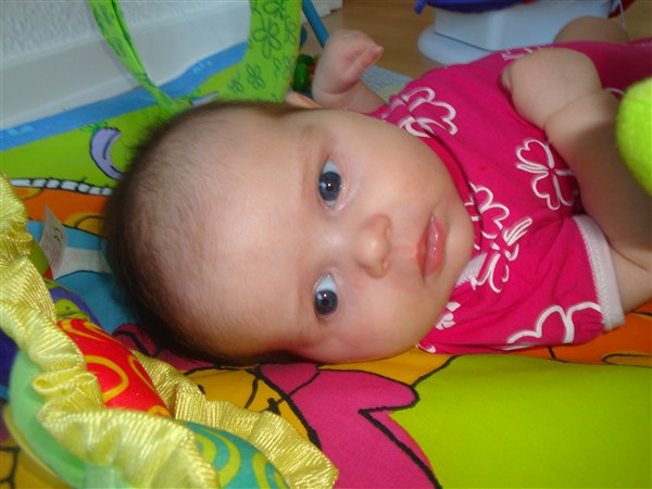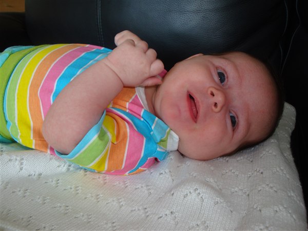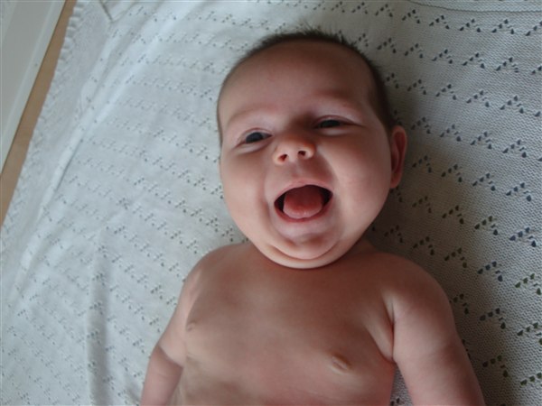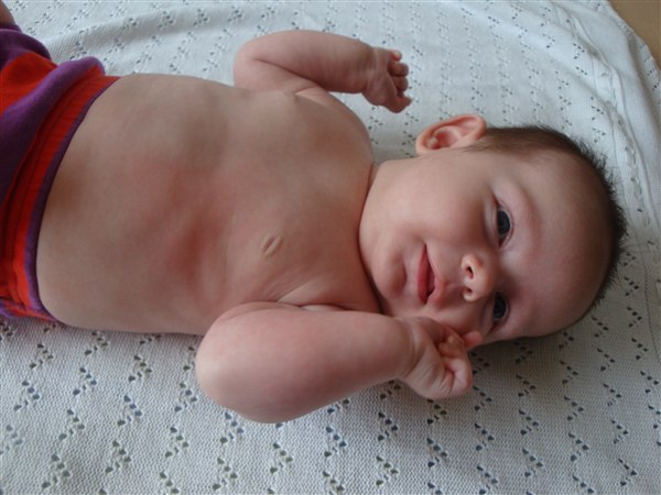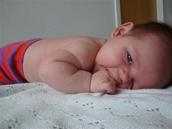 I dag er hun begyndt at rulle fra mave til ryg også, godt 2 uger tidligere end sin storebror