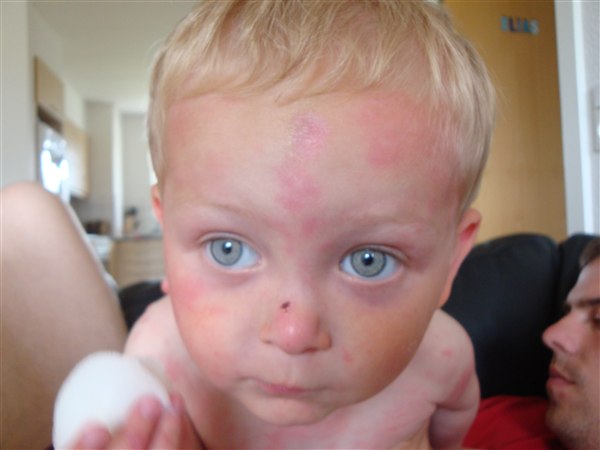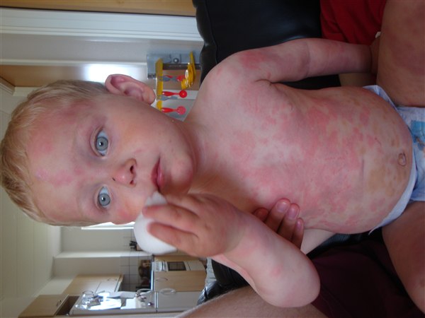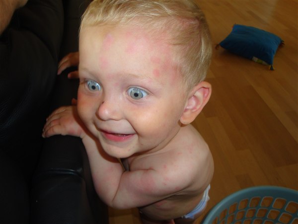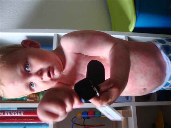Elias har jo haft noget udslæt og været forbi børnemodtagelsen både fredag og i går... Det er heldigvis meget bedre nu, han skal dog lige ind og have taget blodprøver i august, da den læge der så ham mandag mente det havde været en allergisk reaktion på penicilinen, og ikke det de troede i første omgang (da det udslæt ikke burde klø), hvis blodprøverne ikke viser noget skal han ind til en penicilinprovokation...