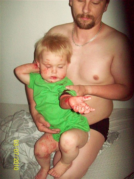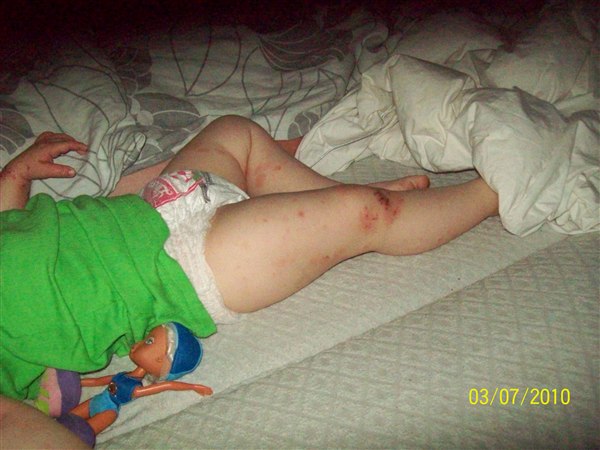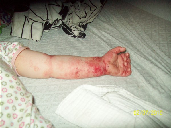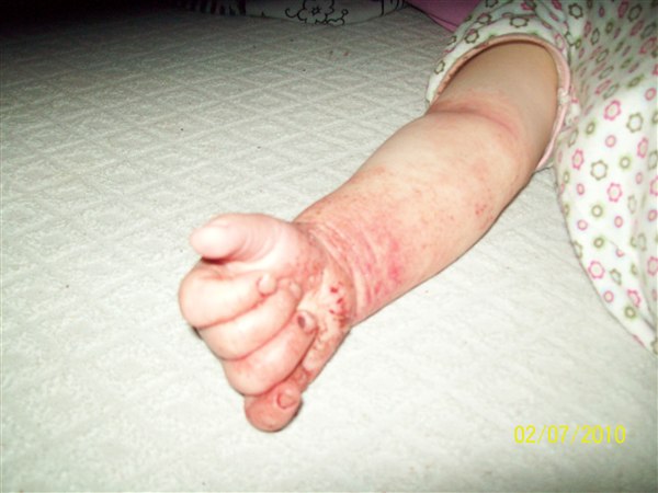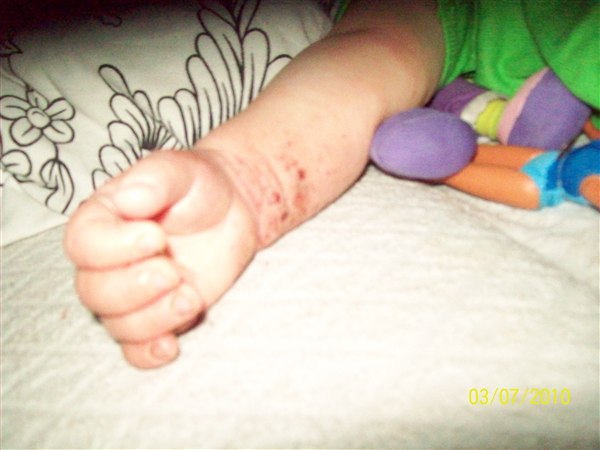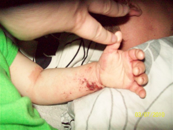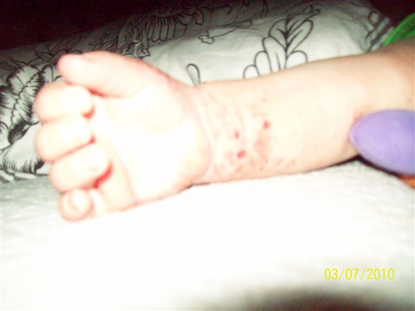 hvis du kigger på billedet 1( det røde på håndleddet ned ved sengen) og såret på billedet 9. Det er det hun kløede hul på i morges og lige nu ligner det et stor "brandsår", væsker, er ømt og det er min. 1-2 hudlag ned. Vi må dårlg nok kigge på det. Men hvad går jeg så hun ikk klø i det i nat eller senere når der kommer sår på. For vi har prøvet med gazekompres og tubegaze kommet om armen, så hun ikk kan klø, men det sætter sig fast på såret AV, ved godt det skal ha luft, men jeg har valgtet ingen luft eller scenen fra i morges om igen og det heler det jo heller ikk af.