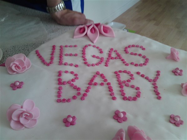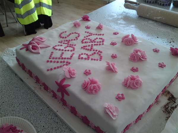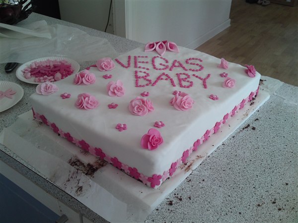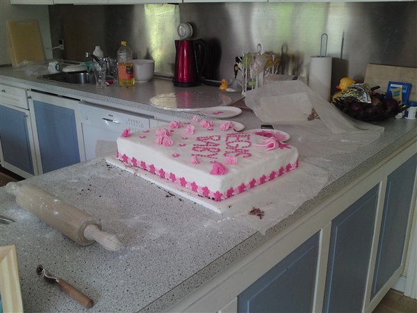 Hun bagte selv kagen og puttede fyld i (mokkacreme) men hendes opsmøringscreme blev flydende og kunne derfor ikke bruges! Vi havde ikke tid til at købe ind til en ny og få den lavet, så kagen blev ujævn i stedet..