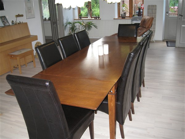 - Langbord + 2 plader + 8 stole i sort læder. Bordet har nogle enkelte ridser. Ny pris alt inkl. 16000,-. 6 år gammelt. PRIS 4000,00