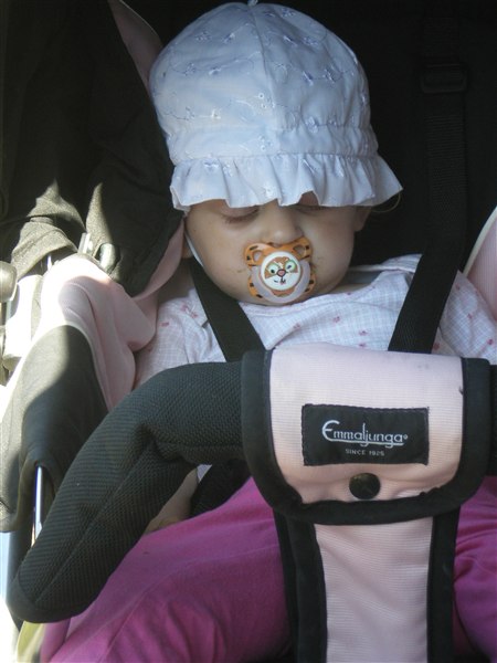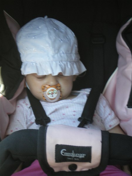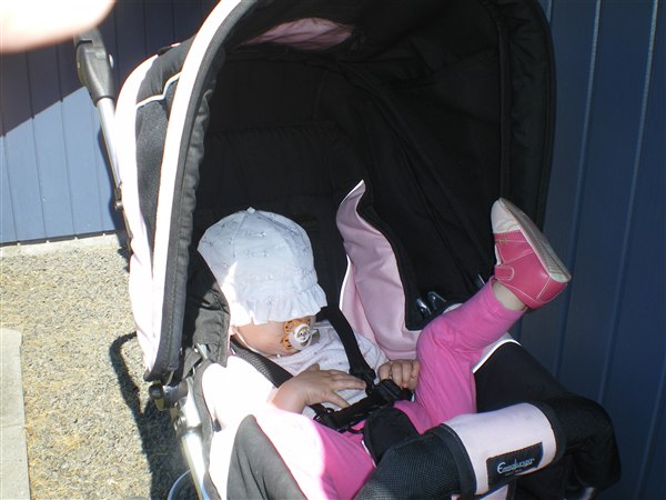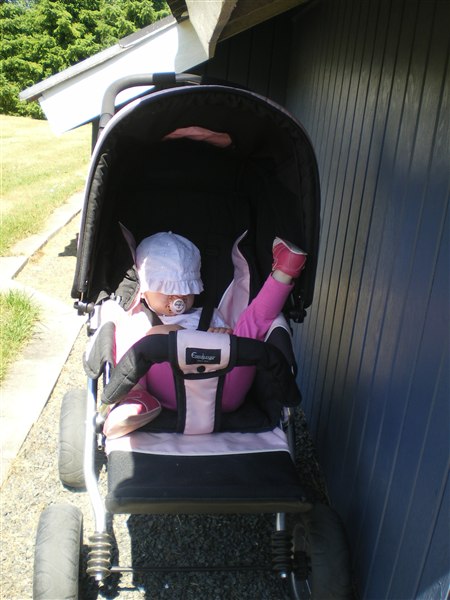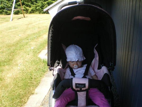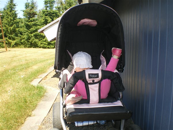 Hvordan pokker kan man ligge sådan i en klapvogn?! Hun må da få ondt i nakken eller noget...