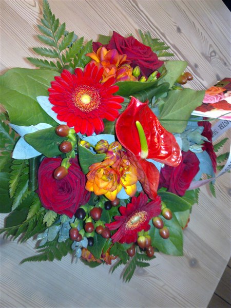 Jeg har jo arbejdet meget den sidste uge (48 timer), og han har været så sød at have noget koldt at drikke klart, når jeg kom hjem ved midnat, har handlet ind, gjort rent, sorteret mine forsikringsparpirer.. og bare sagt "det skal du ikke tænke på skat, det order jeg..."! Det har virkelig rørt mig, og jeg tror også det var derfor at jeg hylede som en pisket da blomsterne kom.... *suk*