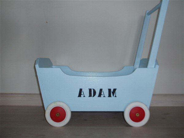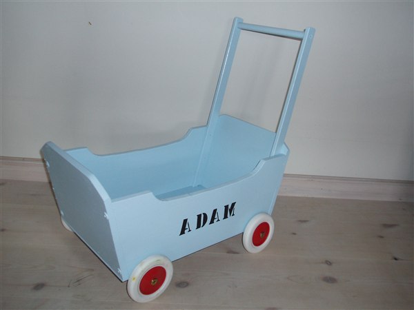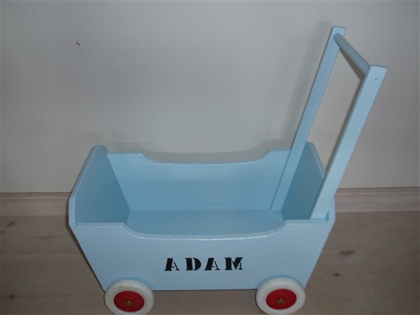 Flot snedkerarbejde, unika model med gummihjul der kan strammes så vognen ikke kører fra barnet