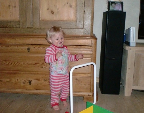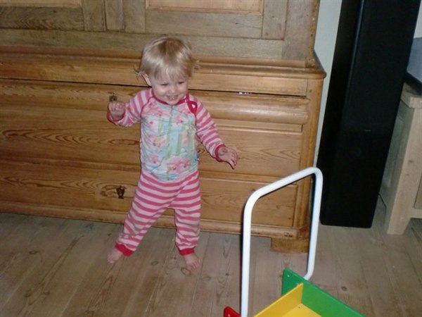 Jeg jublede, så Kenneth kom for at se med. Og så viste hun sig også lige frem for farmand og tog et par skridt mere .....Og vi bliver så stolte, at pigebarnet også selv bliver helt vildt begejstret af stolthed.