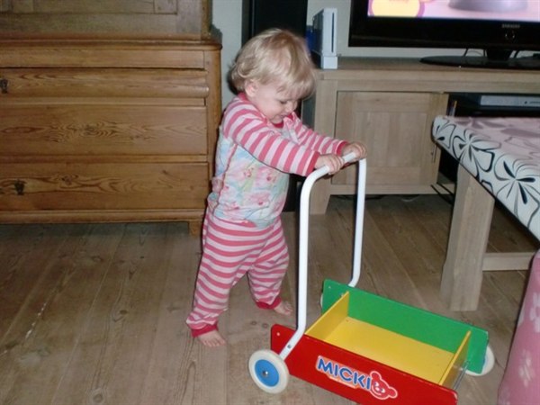 Her står hun foran vores store skab i stuen, og GÅR så et par skridt over til hendes gåvogn.