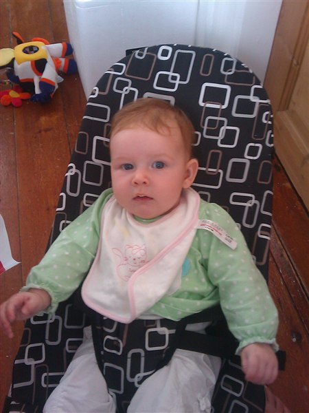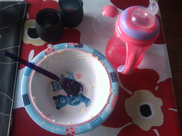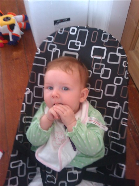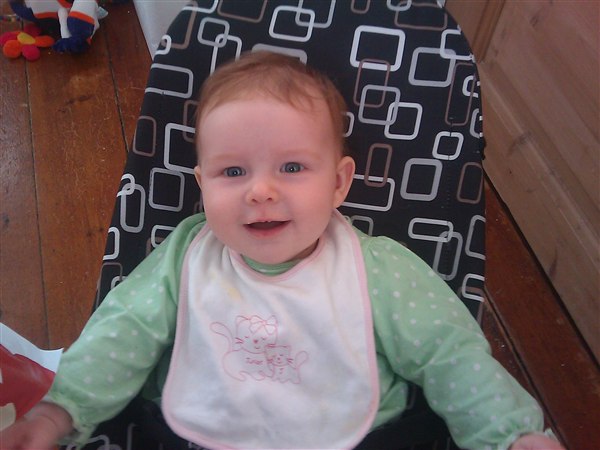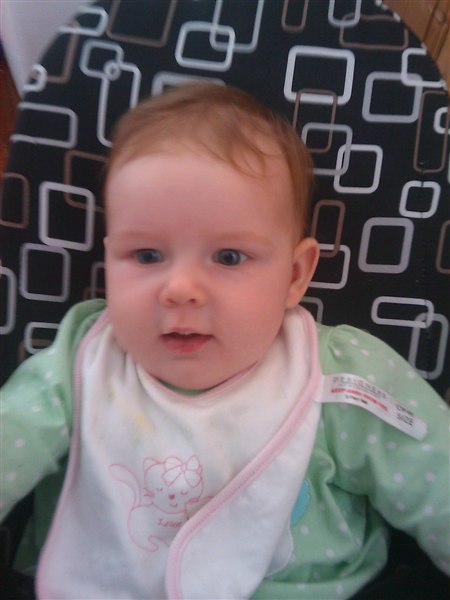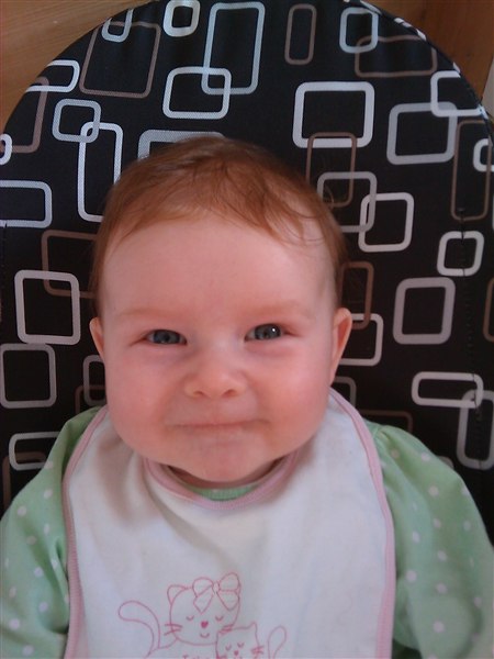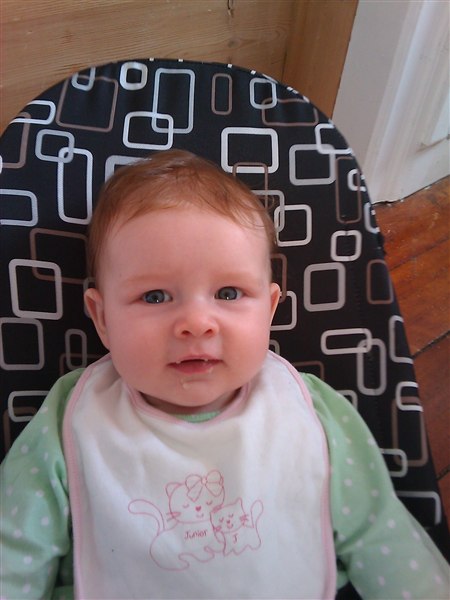 I dag har hun nu fået grød ca hver dag i 14 dage, og for første gang spist en hel portion (ca 2kartofler). Mor her er ret stolt af sin dygtige pige. Hun var virkelig intresseret hele måltidet igennem, og fik da også lov til at prøve selv