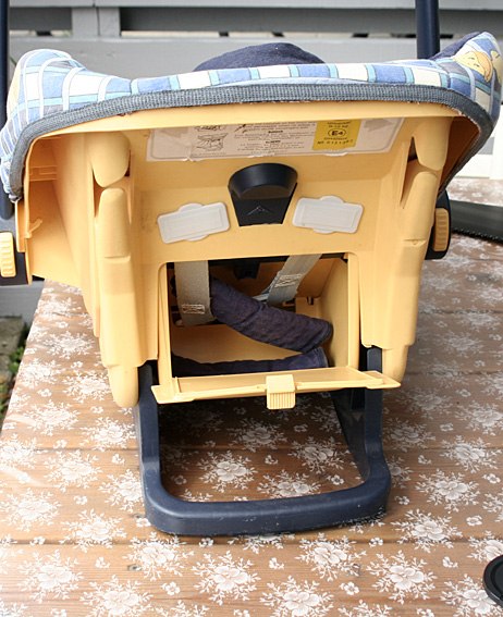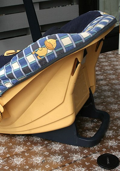 Bærehanken kan enten bruges til legetøjsophæng eller lægges ned ved et let tryk på et par knapper på siden. Spædbarnshovedstøtten, som ses på billedet kan fjernes. Bag på stolen findes et rum til opbevaring.