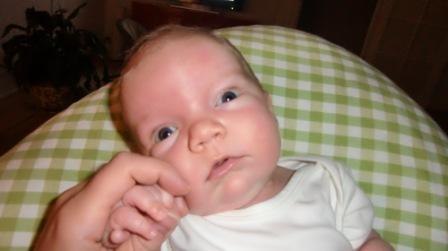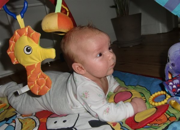 Der sker bare så meget nyt med hende hele tiden: hun er nu blevet mere interesseret i sit legetøj som ellers har ligget og samlet støv i stuen. Hun dasker til det og smiler når det siger lyde, hun er også begyndt at småpludre og "snakke" med mig og bliver så ivrig når jeg svarer