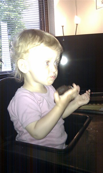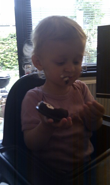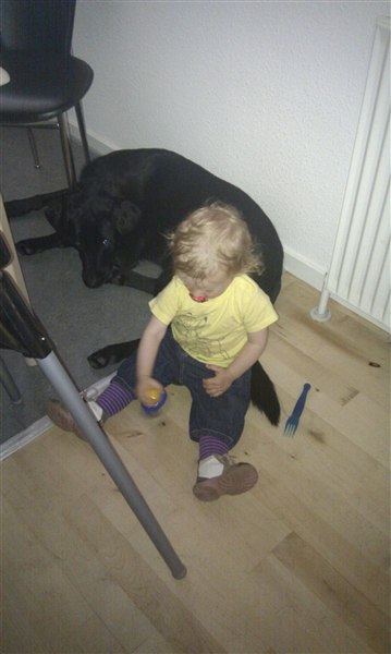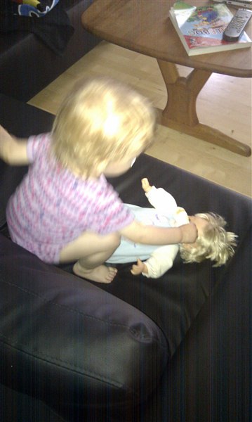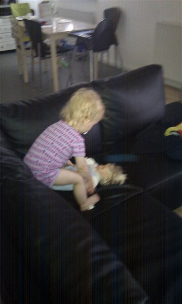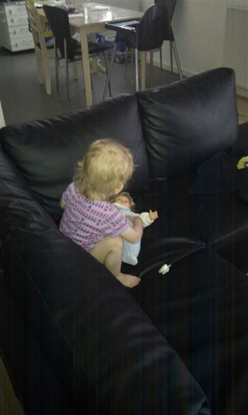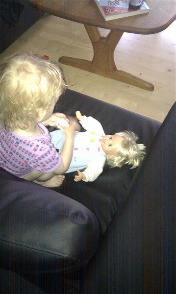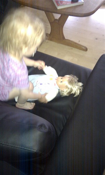 Julie var førhen ikke så glade for dukker der kunne græde osv... Hun tog sig fint af sin dukke igår... Prøvede at give den sutten, den ville ikke som hun ville... Og ja når dukken så ikke vil tage sutten, tog hun den da bare selv.. Det nåede jeg så ikke og få billeder af...
