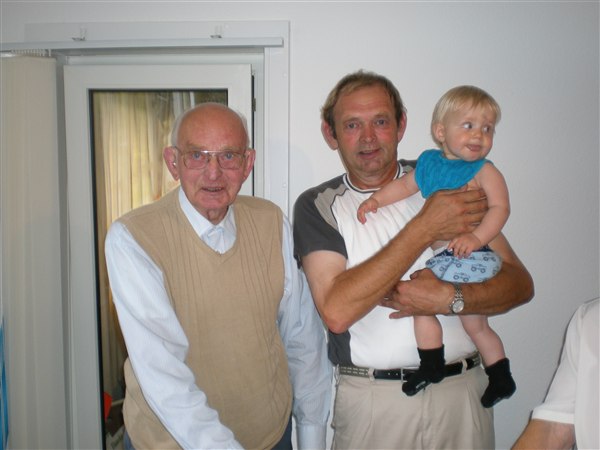 Billed 6: Emil med min far og farfar, lidt svæt at se da Emil drejer hovedet. Men han ligner min far, når han griner minder han om min mor