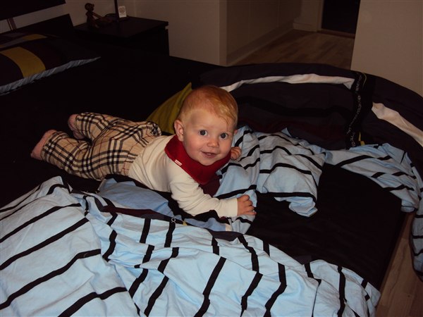 Her er Benjamin på præcis 1 år i dag, med gaven fra Mor og Far