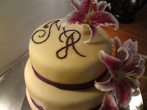 Lavede den til 24/7 til Mikkel og Annemette, men da der var så mange bogstaver i deres navne tilsammen måtte jeg være kreativ og fik hjælp af min dejlige veninde Malene som lavede et monogram som jeg fik lavet med chokolade ovenpå kagen