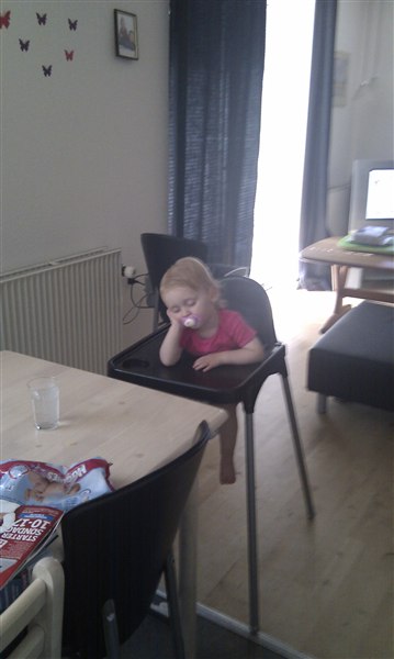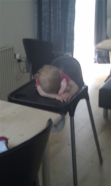 Ja hun falder i søvn de mest mystiske steder... Idag var det ved middags bordet i højstolen... Hun var rigtig træt.. Kæmpede en kamp for at holde sig vågen...
