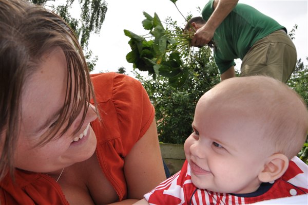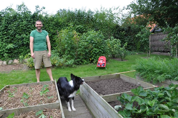 Vi griner af Per, der luskede rundt med en buket jordbærplanter i hånden