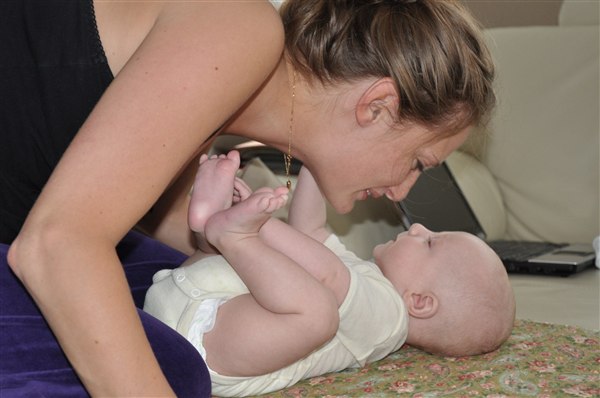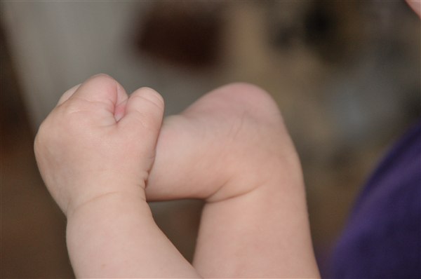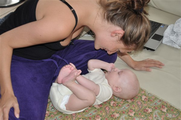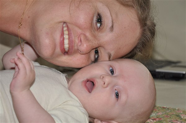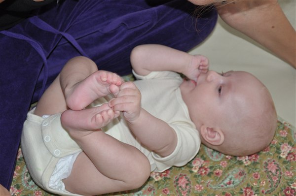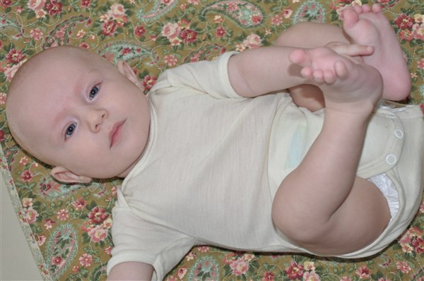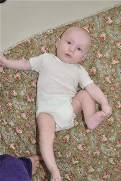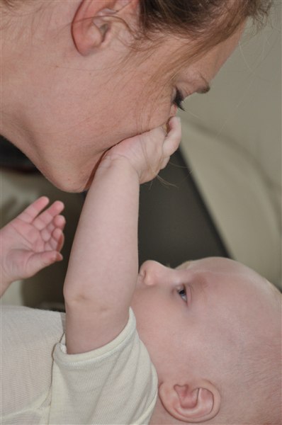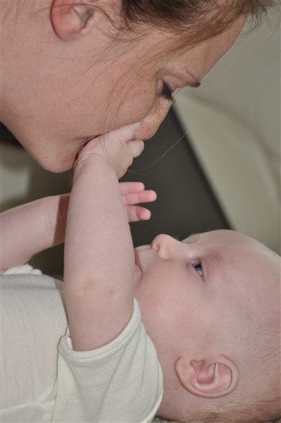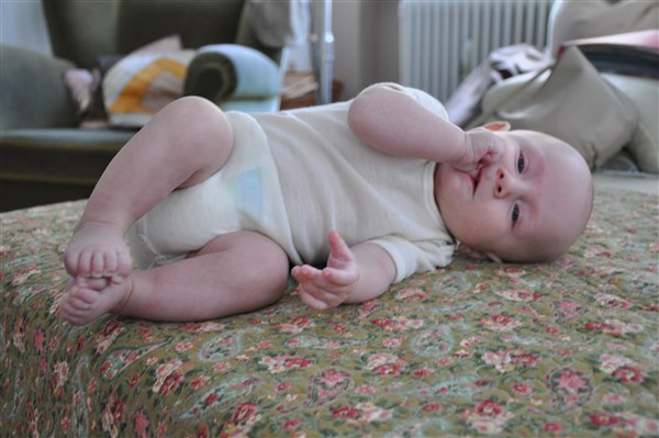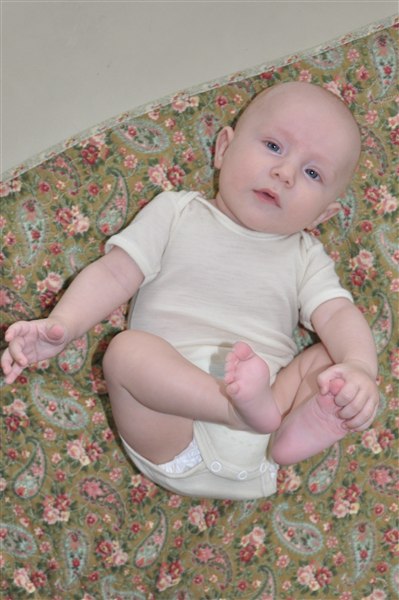 Rosa skriver: I dag har min skønne, dejlige 13-ugers knægt opdaget sine tæer og mit ansigt og har brugt det meste af dagen på at lege med dem - helst med tommelfingeren i munden samtidig Og det skal I da lige se, tøser! Desværre kan I ikke høre de vilde jublelyde han også har lært sig at udstøde i dag, vi har simpelthen været flade af grin flere gange over hans frydefulde skrig og gurglende fniseanfald Desuden opdagede han i går at man kan blæse spytbobler så nu savler han sig ned ad hagen hvert andet øjeblik Desværre har han efterhånden luret kameraet og stopper prompte med at smile når han får øje på det, så det er blevet noget af et kunststykke at få et af hans store gummesmil lige ind i linsen Knus og kram Rosa