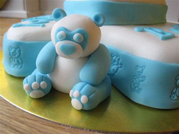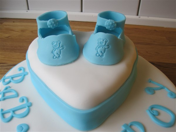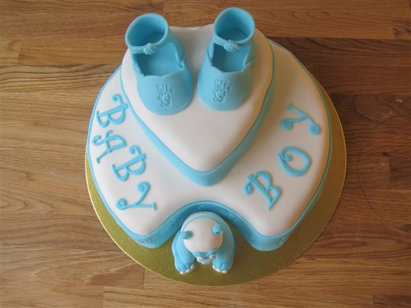 E.T skriver: Her er en baby shower kage til en dreng , der er en god cholokoladekage inden i Skulle lige afprøve det med skoene og bamsen, som jeg ikke har lavet før
