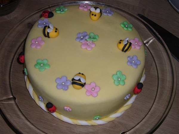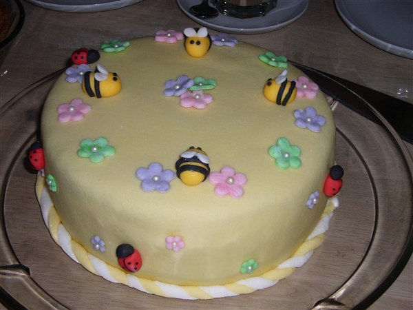Min datters dåbskage jeg lavede sammen med min søster. Hun lavede dyrene og blomsterne. Det havde jeg simpelthen ikke tid til