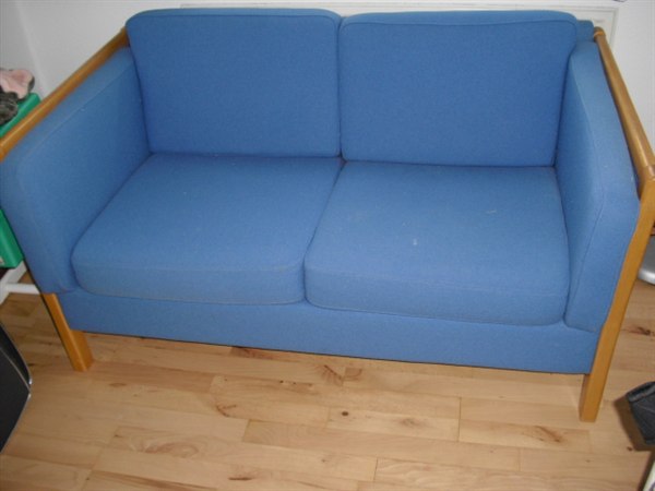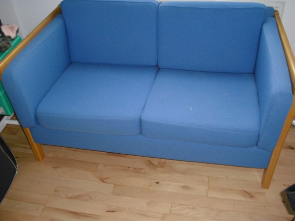 Lille fin 2 personers sofa med blå hynder.