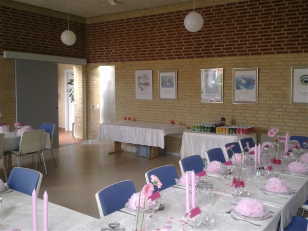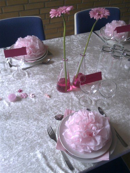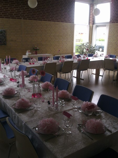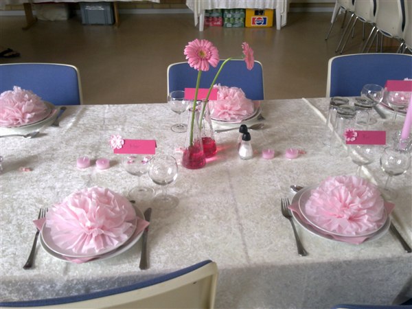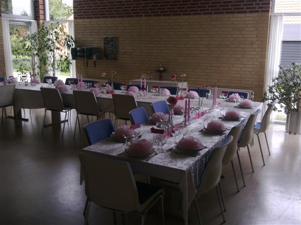 Jeg brugte alm. grene i en vase og havde fået bestilt en masse gode billede af TIno som jeg klippede ud og hang på grenene..!! Vi var 64mennesker - og der var tre lange borde.. på hvert bord var det to vasker med grenene i også med billederne..!!Derefter lagde jeg spraymalede lyseblå rosenhoveder langs bordet.. Vi brugte 30 roser..!! Og vi købte bare de der billige i stedet for hos en blomsterhandler..!! Vi havde ¨så hvid dug og en lyseblå løber..!! Ganske enkel bordopdækning - og meget fin..!!