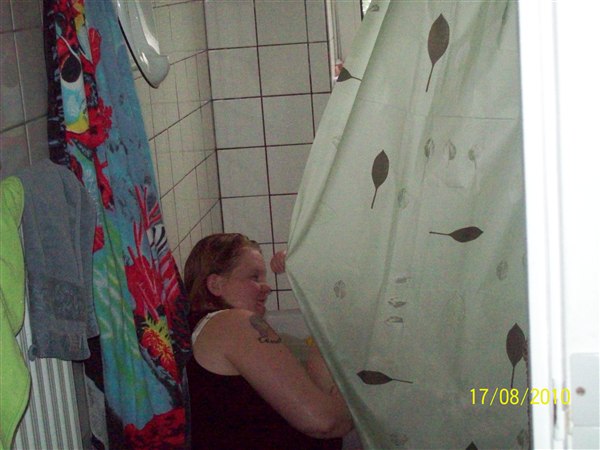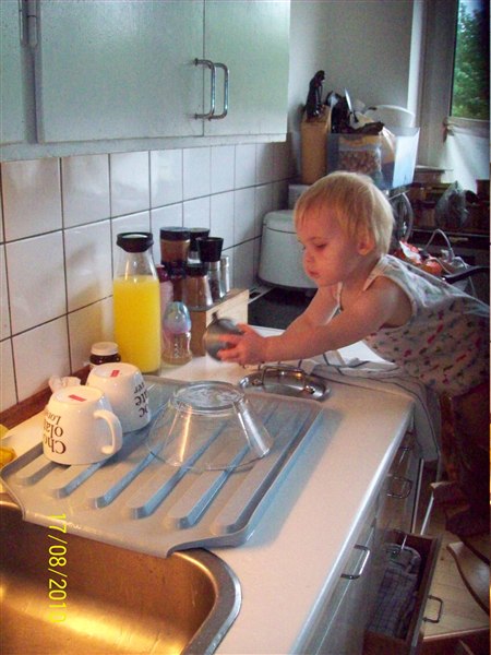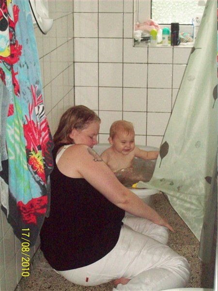 Billede 5-6: Cassandra bader sin mor med tøj på. Jeg bader så Julius.
