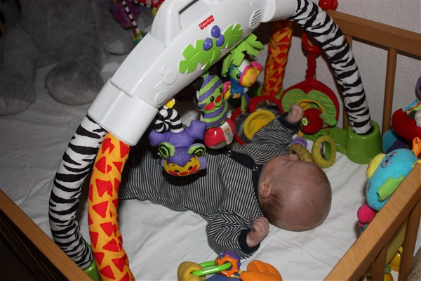 Legetæppet er en blødt tæppe med en blød bøjle med plast på midsten hvor der hænger 3 dyr, en papegøje der gynder frem og tilbage, en abe der gynger op og ned og en bumme lum? der drejer , mens den spiller musik